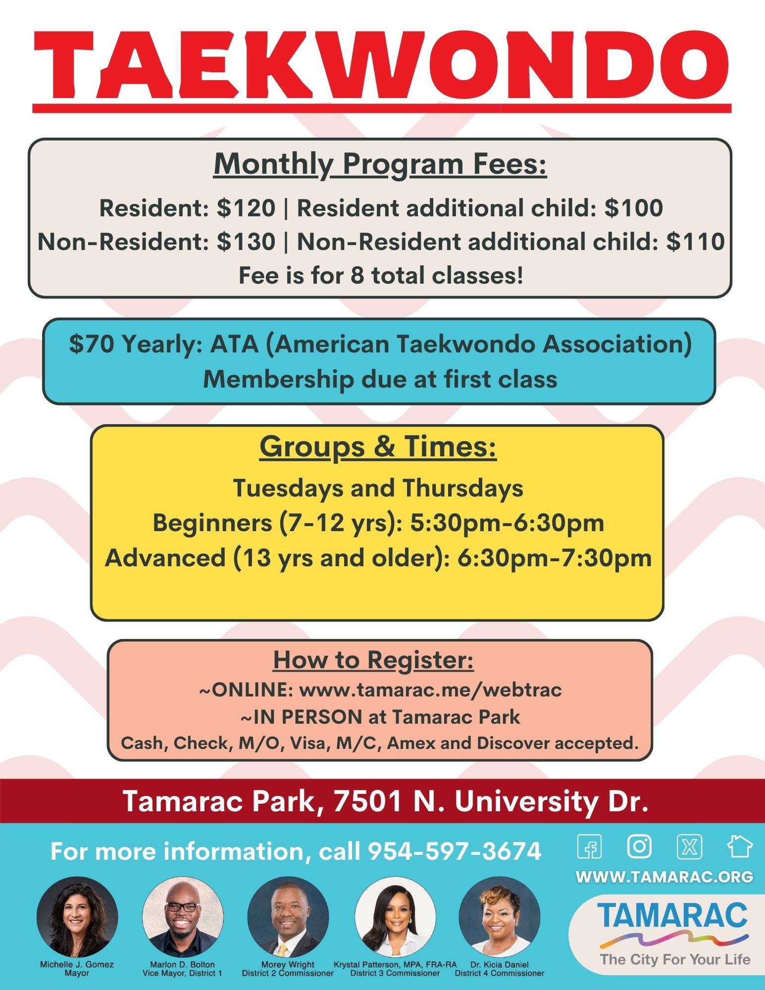 The Tamarac Parks and Recreation Department offers a variety of youth programs for ages 2 years and older. Classes are located at Tamarac Recreation Center, 7501 N. University Drive. Classes and schedules are subject to change.